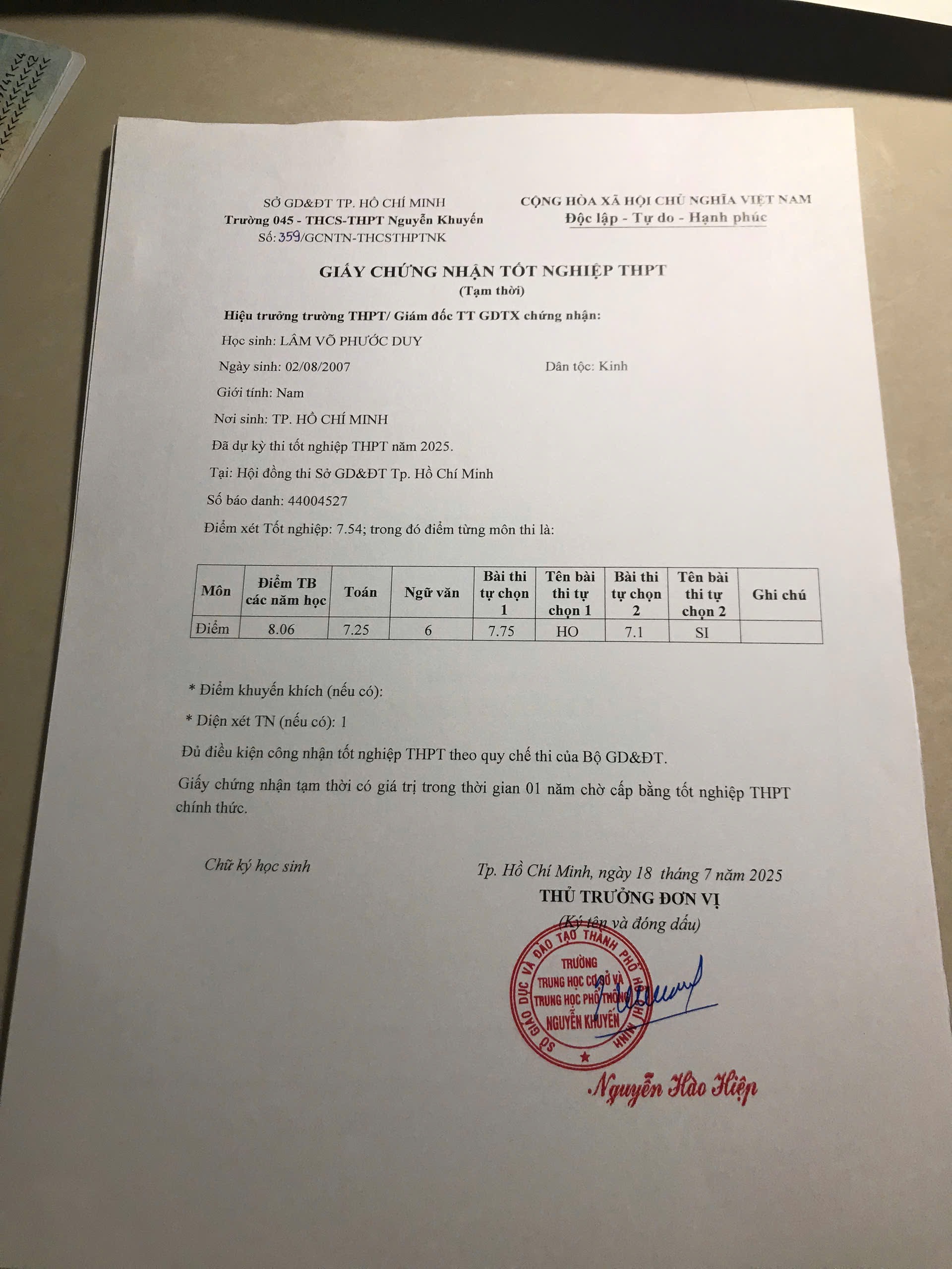 Các môn: Toán, Lý, Hóa, Văn, Tiếng Anh, Tiếng Việt