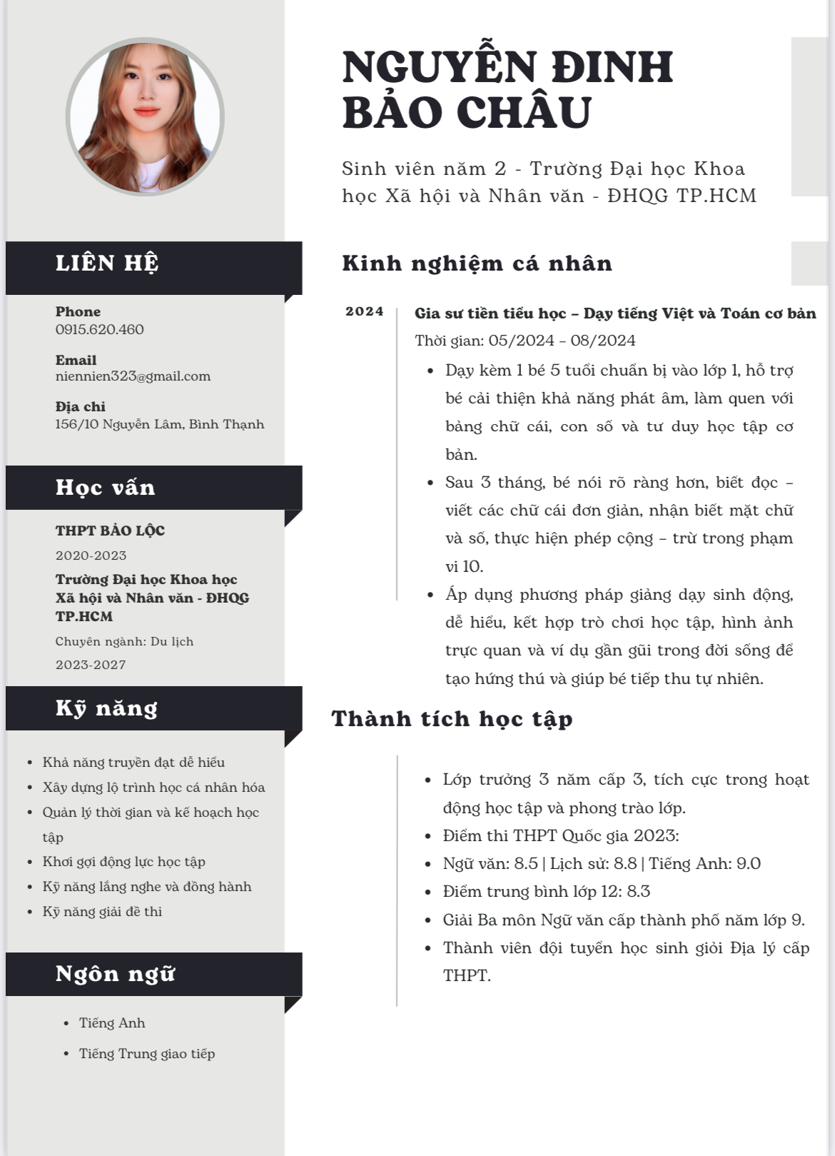 Nhận dạy: Lớp Lá, Lớp 1, Lớp 2, Lớp 3, Lớp 4 , Lớp 5, Lớp 6, Lớp 7, Lớp 8, Lớp 9, Lớp 10, Lớp 11, Lớp nhóm (từ 2 học sinh), Lớp 12, Lớp Năng Khiếu