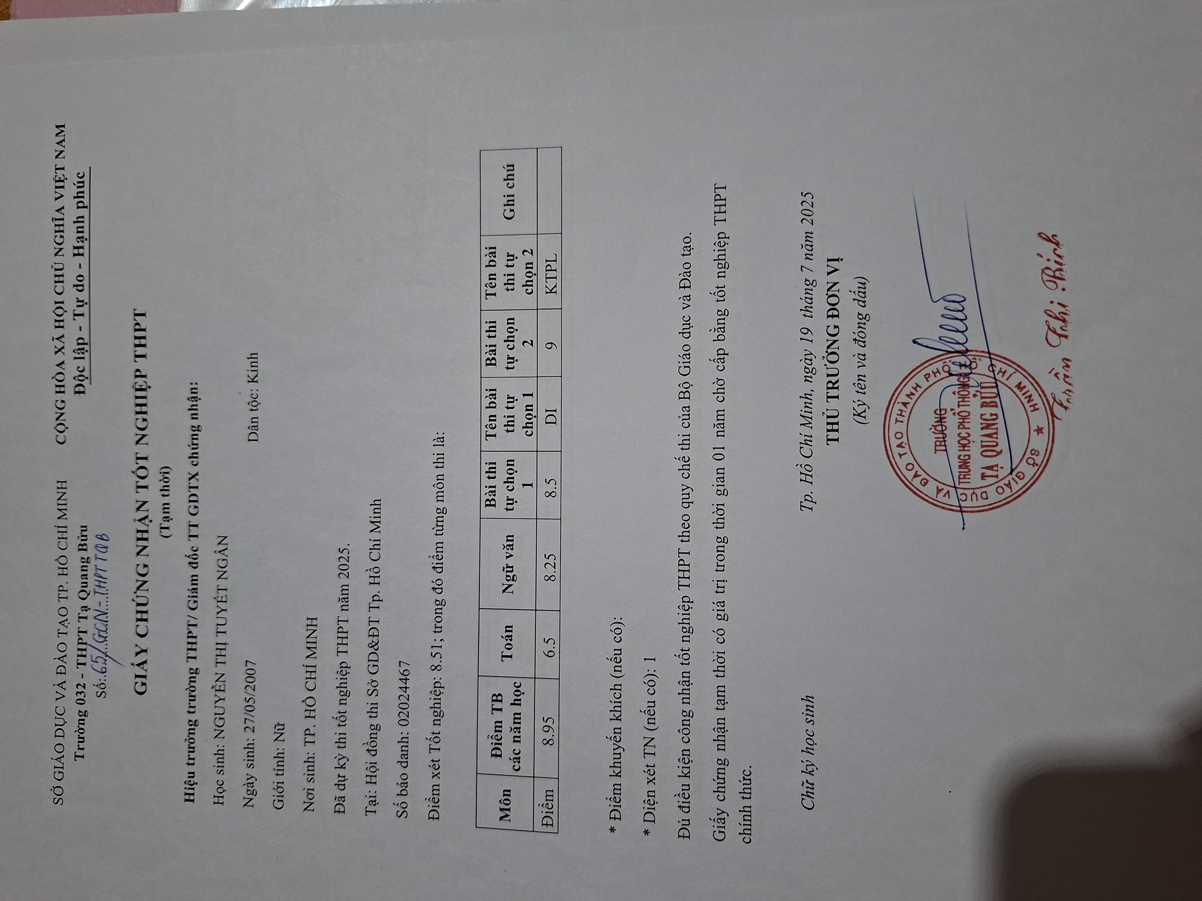 Năm TN: Hiện là sinh viên năm 2