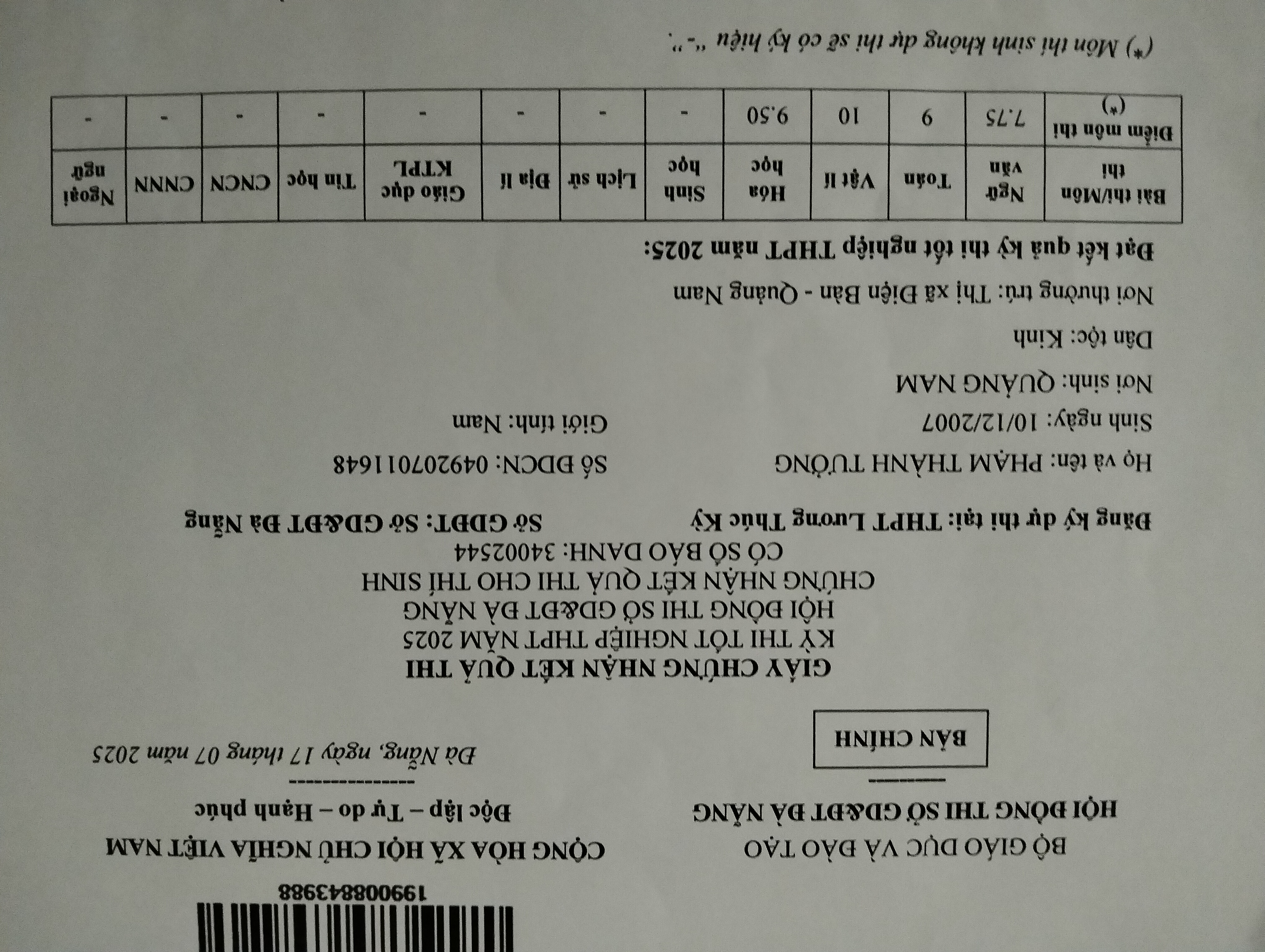 -Điểm thi THPT 2025: Lịch sử:9,50 ; Địa lý:9,25 ; Ngữ văn:8,75